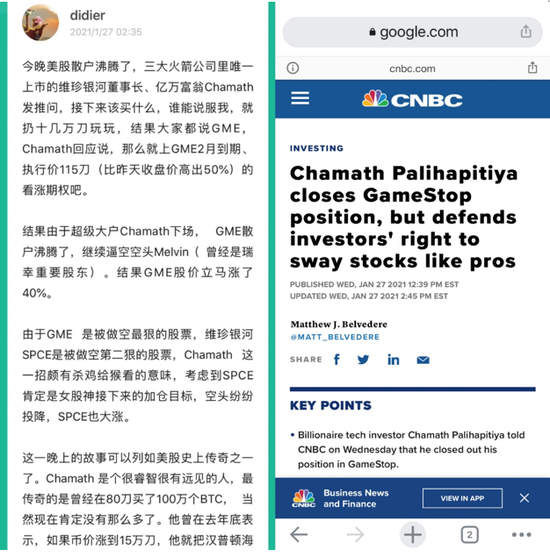回头看,GME事件的高潮并不是来自于因为WSB散户交易受限,股票大跌至193.6,而是来自于CNBC邀请带头大哥 - Chamath上电视展开的讨论。不认识Chamath的人,必须要维基一下,因为这个年代绝对不再是巴菲特的年代,而属于Elon Musk和Chamath这样的人。