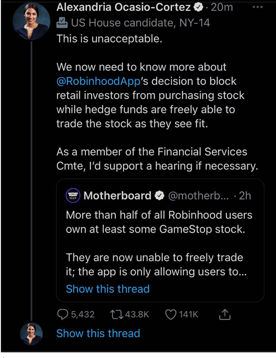可是这些亏红了眼的对冲基金忘了金融的背后就是政治,更何况GME和WSB后面是接近300万张年轻人的选票。周四,至少有两位美国议会财经委员议员(Ted Cruz 和 Alexandria) 公开支持召开听证会。