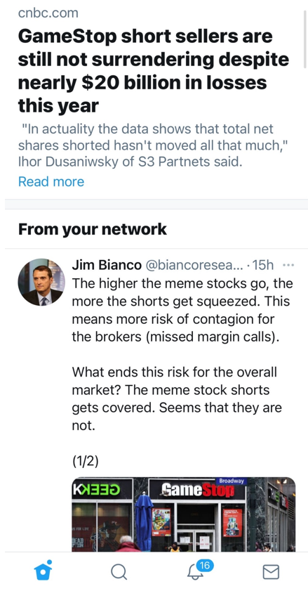 再说一下 Chamath在CNBC采访时提到的GME卖空率为140%。一般而言,卖空仓位/流通股总量被称为“Short Interest,即卖空率” 如果这个卖空率超过40%,就很容易遭遇轧空(Short Squeeze)。而GME这个股票,市场上的流通股总量只有5156万股,但机构卖空总量却高达6975万股,卖空率高达138%,如果再考虑卖出期权的Gamma neutal,那就活生生的自我强化了。