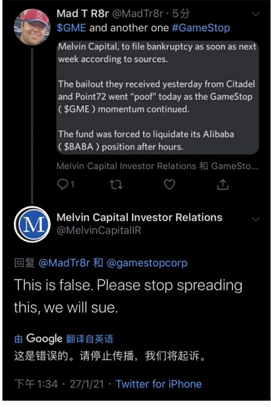 不过,根据CNBC1月27日最新报道,Melvin Capital基金经理Gabe Plotkin告诉CNBC主持人Andrew Ross Sorkin,在遭受巨额亏损后,该基金于当地时间周二下午平仓了GameStop空头头寸。但是CNBC无法证实该公司做空头寸的损失金额。Citadel和Point72已向Melvin Capital注资27.5亿美元,以支撑该基金的财务状况。