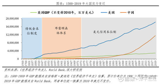 19世纪初,英国率先完成工业革命,为满足战争筹资和殖民扩张需要,1816年英国确立金本位制,通过贸易、殖民等方式将英镑主导的金本位制推向世界,1860-1914年约60%国际贸易以英镑结算,1913年英镑在各国官方外汇储备中占38%。这一时期,尽管美国在1894年GDP赶超英国,但美元并未成为世界货币,1913年美元占外汇储备份额不足5%。直到两次世界大战后,英国实力和国际地位下降,逐渐失去对国际货币体系的掌控,1931年英国宣布放弃金本位,结束了延续一百年的英镑霸权。