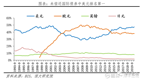 根据BIS,截至2020年一季度,在按面额货币计价的未偿国际债权(包括信贷和债券)中,美元排名第一,占47.4%;欧元排名第二,占37.9%;英镑和日元分别占比7.9%、1.8%,排名第三,第四。