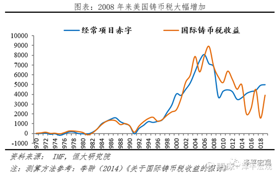 一是美元霸权征收铸币税,输出通胀使债务贬值。凭借外围国家对美元的储备需求,美国向全世界征收铸币税,低成本获取他国的产品和服务。美国支付美元获取他国经济资源,若他国将美元储备下来,美国获得国际铸币税收益,其代价是美国政府需要为他国持有美元储备而支付利息。据测算,美国在1970-1980年每年平均国际铸币税为85.25亿美元,2001-2010年高达6345.93亿美元。