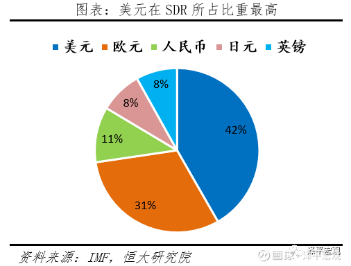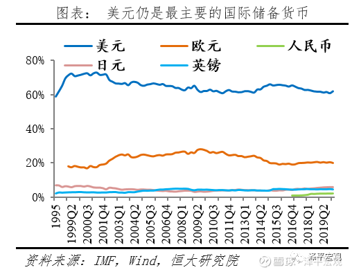 根据IMF的统计,截至2020年一季度,全球已分配外汇储备中,美元排名第一,占61.99%,尽管1999年以来呈现递减趋势,但始终稳定维持在60%以上的储备占比。美元在IMF特别提款权中的构成权重达41.73%,其次是欧元,权重为30.93%;2016年10月1日人民币正式被纳入SDR货币篮子,权重为10.92%。