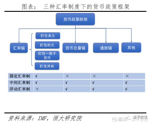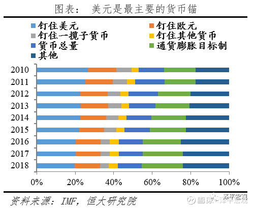美元是全球流动性之锚。当前普遍实施的汇率制度分为硬钉住(固定汇率制)、软钉住(中间汇率制)和浮动汇率制三大类。其中,选择固定汇率制和中间汇率制的经济体,货币政策紧密跟随锚货币调整,2018年,共有38个IMF成员直接将美元作为货币锚,占比19.8%。另有31个实施自由浮动汇率制度,占比16%,但间接到受美元影响。