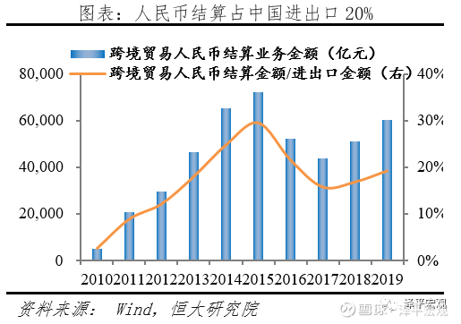 贸易层面, 2009年启动人民币结算试点以来,人民币结算的跨境贸易占中国进出口比重从2010年2.5%提升至2019年20%。从全球来看,2011-2019年人民币全球支付份额从0.29%升至1.94%,目前是全球第6大支付货币。
