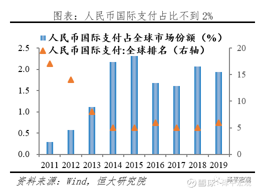 现状:人民币在国际货币体系中的地位与中国在世界经济中的地位不匹配。截至2019年,人民币全球支付份额仅1.94%,国际储备份额占比1.96%,与中国GDP占世界比重16%不匹配。