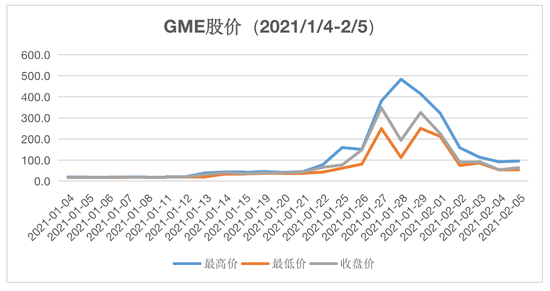 由于疯狂的轧空,GME股价1月28日最高价曾达483美元,当日最低价112美元,开盘价265美元,收盘价194美元,连续几日股价这么上蹿下跳,2月5日收盘价回落至63.8美元,比收盘价最高的1月27日跌去82%,比1月28日的最高价跌去87%,但仍比2020年12月31日收盘价18.84高出238%。
