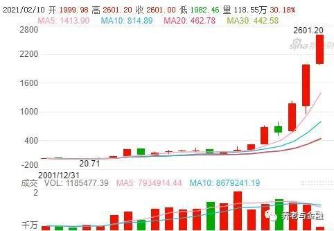 截止2021春节前最后一个交易日,贵州茅台A股收盘价2601元,再创历史新高,其市值更是高达32674亿元,超过了工行、招行、中行三家银行A股市值的总和。其中,工商银行A股市值为14155亿元,招商银行A股市值11253亿元,中国银行A股市值6745亿元。