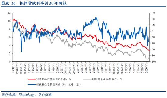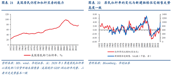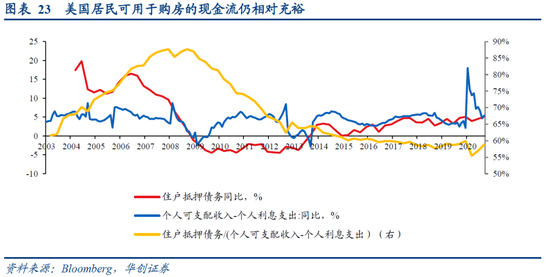 居民部门仍有较强的购房能力。从静态的居民杠杆率来看,金融危机后美国居民部门开始去杠杆,2020年3季度居民部门杠杆率为77.5%,较2008年1季度的峰值98.6%仍低21.1个百分点左右,居民部门杠杆率的变化与新建独栋住宅销售走势高度一致,居民部门仍有加杠杆购房的能力。从动态的现金流角度来看,我们以美国个人可支配收入减去利息支出衡量居民部门的“自由现金流”,自由现金流的同比增速从2009年以来基本都高于居民住宅抵押债务的同比增速。抵押债务/“自由现金流”的比值自2012年下半年以来持续处于低位,目前处于金融危机后的最低水平(目前是59%,金融危机前高值是88%),中长期视角看,居民部门可用于购房的现金流仍然相对充裕。