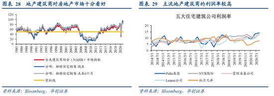 NAHB市场指数是衡量美国全美建筑商信心的扩散指数,在2020年5月跌下荣枯线后快速反弹,目前已处于83的高位。在分项指数中,美国建筑商对当下和未来六个月的房屋销售仍十分看好,建筑商对未来市场走势的信心仍然较强。