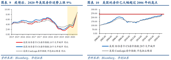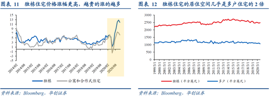 疫情肆虐下,2020年美国经济虽遭重创,但房价却逆势上涨。2020年美国房价逆势上涨9%左右,年涨幅是2006年以来最高,房价已高于次贷危机前高点21%。从房屋类型看,独栋住宅的价格同比涨幅要比公寓和合作式住宅高出5-6个百分点,即越贵的涨的越多。其中的原因有二,一是疫情一定程度上改变了人们的居住需求,搬离市区和寻求独立住宅空间以预防疫情成为改善型住房需求的关键点;二是疫情后居民财富呈现K型变化,富裕群体的购买力并未因疫情受损,反而受益于金融市场的上涨而增加,富裕群体的需求是独栋住宅价格飞速上涨的主要支撑力量。