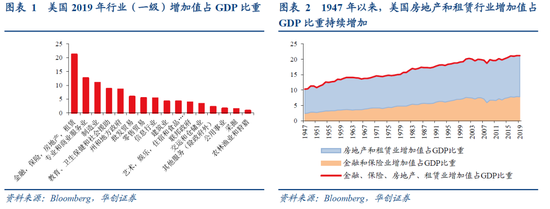 第一,从GDP占比来看,美国房地产和租赁业在经济中的支柱作用十分显著,以12%的权重位居美国第一大行业。美国房地产和租赁业增加值占GDP的比重,从1947年以来一直保持缓慢上升的趋势,近年来维持在13%左右。从行业对比看,以2019年数据为例,一级行业分类中,金融、保险、地产和租赁业占比最大,为21.2%。进一步细分到二级行业,美国房地产和租赁业增加值占比为12.2%,在所有二级行业中排第一,是美国经济的支柱性行业。