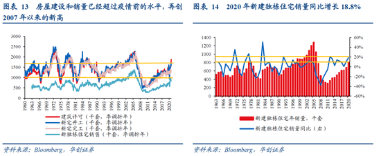 虽然房地产市场迅速升温,但住宅投资对美国经济增长的拉动还未体现在去年三季度的GDP数据中(拉动2020Q3实际GDP同比0.27个百分点)。住宅投资计入GDP是按照实物建造量统计的,受疫情影响,工人无法顺畅施工,住宅开工和建设进度较慢。随着疫情防控逐渐到位,建造施工逐渐提速,美国住宅投资对GDP的拉动已在Q4数据中体现(拉动2020Q4实际GDP同比0.52个百分点,仅次于私人商品消费)。随着美国房市销售的火热(销售领先住宅投资约1个季度),预计住宅投资对今年美国经济增长的拉动或偏强。
