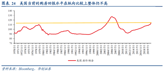 居民购买力的另一个影响因素是购房回报水平,美国当前的租售比相对水平在横向和纵向比较上整体仍不高。就美国的房屋租售比而言,第一,横向比较。美国当前的房屋租售比仅为1∶113.7,仍处于合理水平。相比之下,根据《全国重点50城租金收入比调查研究报告》数据,2019年上半年我国50个重点城市的租售比达到1∶592。第二,纵向比较。美国房屋租售比虽从2012Q1的1∶91.8上行至2020Q3的1∶113.7,但相比2006年底的历史峰值1∶126.8,仍有一定的差距。目前的租售比与2004年年中的水平大致相当。当前,居民购房的回报水平基本是合意的,并未过度极端化。