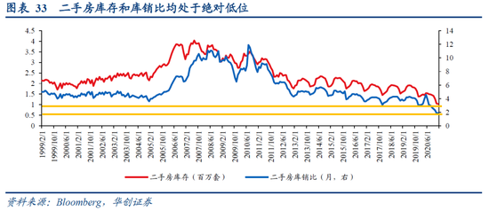 目前美国住宅库存低,库销比也处于低位,库存水平仍能推动房地产市场继续向上。从新建房看,目前新建独栋住宅(新建独栋住宅占新建住宅的70%左右)待售量为30.8万套,库存处于相对低位,和2001年相当,但库销比处于历史绝对低位,按目前的水平,待售的新建独栋住宅仅能支撑4.6个月的销售。从二手房看,当下二手房库存约为104万套,二手房库销比为1.9个月,两者均处于历史绝对低位。处于低位的住宅库存和库销比能够支撑房地产市场延续热度。