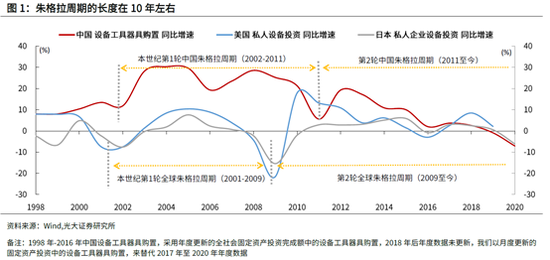 朱格拉周期理论认为,市场经济受设备更替和资本开支驱动,存在着9至10年的波动周期。由于存在磨损折旧、技术替代等因素,机器设备往往存在一定的更新周期,当经济中机器设备开始大量更新换代时,固定资产投资将大幅增加,推动经济进入繁荣期,而后随着设备更新完成,固定资产投资回落,经济周期将转为衰退。设备的周期性替代带动了固定资产投资的周期性变化,最终产生了9至10年的经济周期。