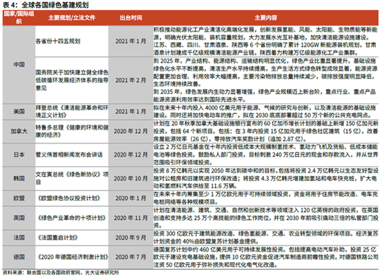 在推进碳中和的过程中,绿色基建投资成为重点关注的领域,各国清洁能源的基础设施建设加速推进,相关计划纲要陆续出台。绿色基建是指那些基础建设类项目及其产业上下游产业中能够支持环境改善、应对气候变化和资源节约高效利用的活动,即与环保、节能、清洁能源、绿色交通、绿色建筑等领域相关的项目。拜登在其《清洁能源革命和环境正义计划》中表示,拟在未来十年内投入4000亿美元用于能源、气候的研究与创新,以及清洁能源的基础设施建设。欧盟计划在未来十年内筹集至少1万亿欧元用于可持续领域投资;中国各省份相继将光伏、光+储能、水风光、光热等新能源列入十四五规划,其中,江苏、西藏、四川、甘肃酒泉、陕西等6个省份明确了累计120GW新能源装机规划。2021年2月,国务院出台关于加快建立健全绿色低碳循环发展经济体系的指导意见,建立健全绿色低碳循环发展经济体系,促进经济社会发展全面绿色转型。绿色基建投资成为全球未来基建投资的重要领域。