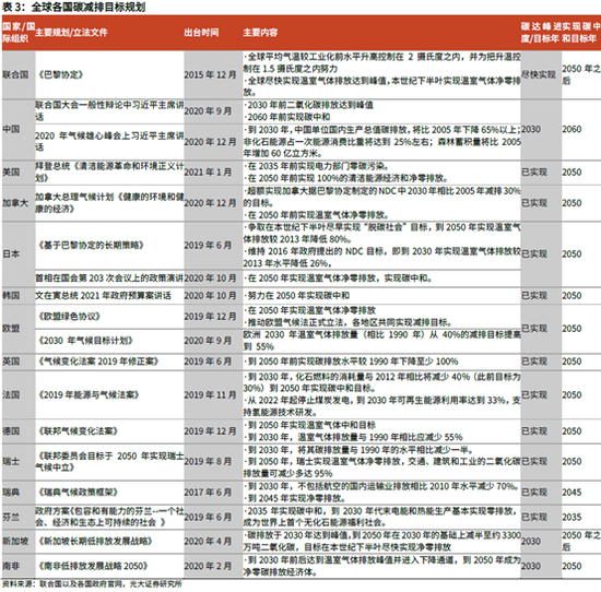 碳减排成为全球共识,各国碳减排目标规划相继出台,全球气候治理格局迈上新台阶。美国方面,拜登上台第一天便宣布重返《巴黎协定》,并火速推出《清洁能源革命和环境正义计划》,正式提出在2050年前实现100%的清洁能源经济和净零排放的目标。中国方面,力争于2030年前达到碳排放峰值,努力争取2060年前实现碳中和。欧洲方面,2019年《欧盟绿色协议》设定了在2050年实现温室气体净零排放的目标,2020年9月,将2030年温室气体排放量从目前40%的减排目标提高到55%。日本方面,首相菅义伟国会施政演说,日本将在2050年实现碳中和;韩国方面,制定《韩国2050碳中和战略》,承诺2050年实现碳中和。