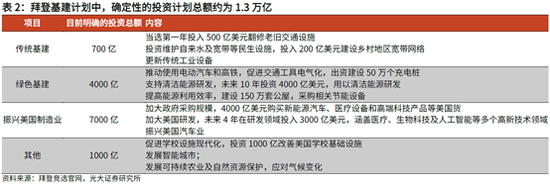 拜登基建计划总投资规模达2万亿美元,包括公路桥梁等传统基建,清洁能源、电动汽车为主的绿色基建,振兴美国制造业计划,以及促进学校现代化、推动智慧城市建设等。其中,较为确定性的投资计划约为1.3万亿美元,横跨未来10年。但是,基建计划规模未来有望继续扩容,2021年2月18日,在美国总统拜登在白宫椭圆形办公室会议上接待劳工领袖时,劳工领袖提出希望拜登批准高达4万亿元的新基础设施支出。同日,华盛顿邮报报道,民主党高级官员已经讨论了高达3万亿美元的新支出方案。
