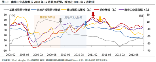 基建和房地产投资火热,拉动商品价格连续上涨2年。房地产和基建投资火热,直接拉动了上下游包括钢铁、有色、建筑建材等大宗商品的需求,拉动商品价格连续上涨。以南华工业品价格来看, 2008年受到全球经济危机的影响快速下挫, 2008年12月伴随中国基建增速上行,开始触底回升;2010年基建投资走弱,房地产投资接力,继续支撑大宗商品价格上行。房地产投资在2011年初开始加速下行,南华工业品及铜价的价格同比增速在2011年2月达到顶点,螺纹钢在2011年5月达到顶点。