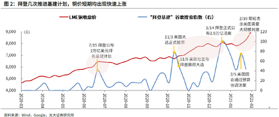 2021年2月18日,美国总统拜登在白宫椭圆形办公室会议上接待劳工领袖,讨论两个主要优先事项:1.9万亿美元刺激计划及美国基建计划。劳工领袖提出希望拜登批准高达4万亿元的新基础设施支出。同日,华盛顿邮报报道,民主党高级官员已经讨论了高达3万亿美元的新支出方案。2月19日,美国财长耶轮表示,大规模刺激计划仍是让经济恢复全面强劲的必要措施。讨论声中,2月19日,LME铜价大涨4.54%,收盘8941美元/吨,创下2011年9月以来的新高。