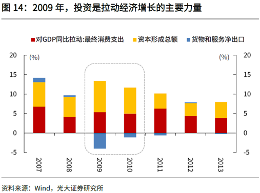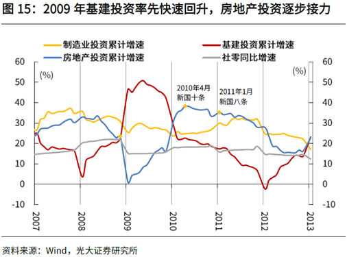 2009年基建投资率先快速回升,房地产投资2010年逐步接力。一揽子刺激计划下,基建投资在2009年一季度率先启动,上半年增速快速提升,2009年6月累计增速达到最高点50.78%,相对于2008年年底提升了28个百分点。而后,基建投资进入下行通道,房地产投资渐渐发力。2008年12月17日国务院常务会放宽个人购二套普通自住房贷款,12月21日国务院办公厅发布扶持房地产开发企业的“国13条”。政策放松下,房地产投资从2009年初开始上行,到2010年初,投资增速回到2008年水平。2010年4月17日,为了抑制部分城市房价过快上涨,新国十条出台,各地纷纷出台限购政策,房地产增速在5月达到顶点,随后进入缓步下行区间。2011年1月26日,国务院发布“新国八条”,进一步收紧调控,房地产投资增速开始加速下滑。