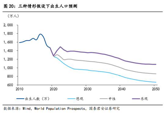 即使中国总和生育率在乐观假设下有望提升至1.6的水平,但仍然不改变新生儿数量长期持续减少的趋势。生育限制放开后的前几年,前期堆积的生育意愿或集中释放,短期新生儿数量会有增加,但随后会进入持续下滑的通道。基于悲观/中性/乐观的情形,我们测算(具体测算方法参考国君宏观研究报告《人口“通缩”时代正在拉开大序幕》),“十四五”期间平均新生儿数量约为1109/1231/1416万左右。也就是说,无论在哪种假设下,未来出生人口数量都将惯性减少。