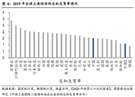 假设长期总和生育率维持在2019年的1.09左右,那么总人口拐点将在2023年左右到来。2019年中国出生人口中二孩数量远超一孩,表明存在二孩堆积效应。剔除堆积效应后总和生育率从1.51下降至1.09,在主要经济体中仅略高于韩国的0.92,甚至大幅低于日本的1.36。