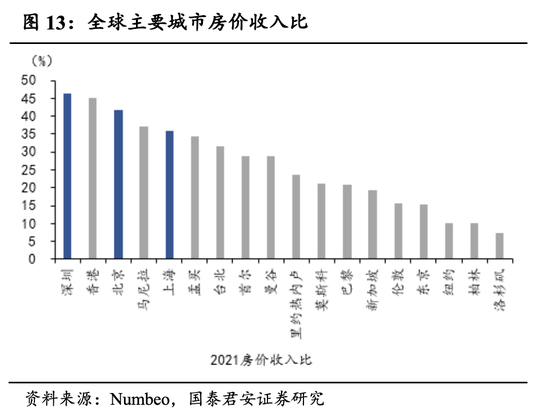 高房价会在很大程度上压制生育意愿进而影响生育率。目前中国的房价收入比位于全球前列,根据Numbeo数据,2021年深圳、北京、上海的房价收入比都在35以上,远高于纽约、伦敦、东京等国际大都市。也就是说,一个普通人不吃不喝在深圳、北京需要工作40多年才能买得起一套普通大小的商品房。如果考虑一个家庭夫妻二人都工作,这个年限将缩短至20多年。一旦有了孩子,势必对家庭住房会有更高的要求:1)托幼机构匮乏,需要请老人或者月嫂到家看护,需要更大的住房面积;2)想让孩子受到好的教育,需要相应的学区房。这种畸形的住房成本,会令育龄夫妇打消生育二孩甚至一孩的念头。