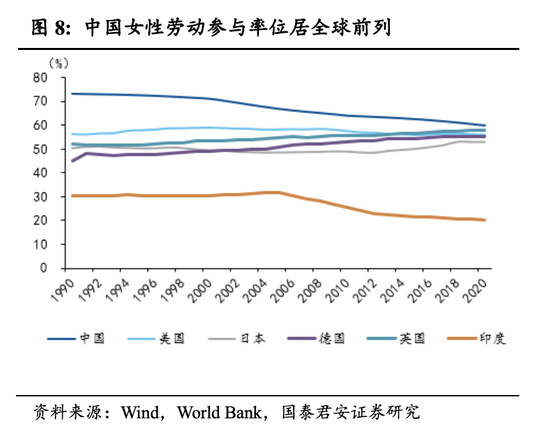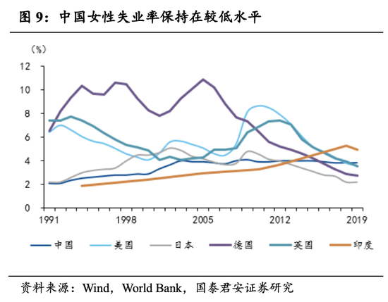 中国女性在劳动参与率长期高于世界上绝大多数国家的同时,保持着较低的失业率。因此,中国女性生育的机会成本相对较高。对职业女性来说,生育的黄金年龄往往也是关键的事业上升期。生育之后可能面临收入降低、支出倍增、生活质量下降等一系列问题。因此,在没有养儿防老需求的情况下,很多职业女性会选择少生育甚至不生育。
