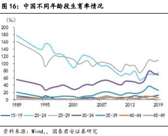 第三次婴儿潮人口尚在生育主力期,一旦生育政策转向,生育率有望提升。上世纪50年代以来,中国共有三次婴儿潮。第一次是在1950年代,出生人口连续8年在2000万以上;第二次是在1962年自然灾害结束之后,出生人口连续12年在2500万左右甚至更高;第三次是从1980年代后期到1990年代初期,新生儿在2200~2500万的水平。目前第三次婴儿潮的人口普遍年龄是25~33岁,尚处于20~34的主力生育区间。同时注意到,随着二孩开放和生育技术进步,较高龄妇女的生育率显著提高,且这一趋势有望继续。根据2017年的抽样调查数据,30~34岁妇女生育率快速从2015年的52.27‰上升至79.43‰;35~39岁妇女生育率也从25‰提升至37‰。在“十四五”期间,第三次婴儿潮人口普遍年龄为30~40岁,基本都还将继续处于主力生育期。