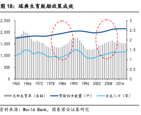 俄罗斯、瑞典等国在实施生育鼓励政策后的新生儿数量反弹都有育龄妇女规模的周期性扩张相配合。出生人数是生育率与育龄妇女数量的乘积,只有总和生育率上升配合育龄妇女数量增加,才能产生明显的出生人口数量反弹。两国的出生人数变动均符合25~30年生育周期。俄罗斯总和生育率达到低点时育龄妇女数量已经开始增加,随后两者共同推动出生人数增加。瑞典有两次总和生育率回升都稍早于育龄妇女规模扩张,所以在总和生育率回升的中后期才会看到出生人数显著上升。
