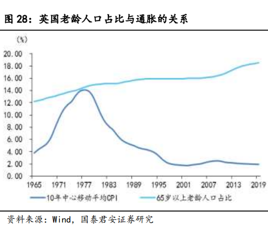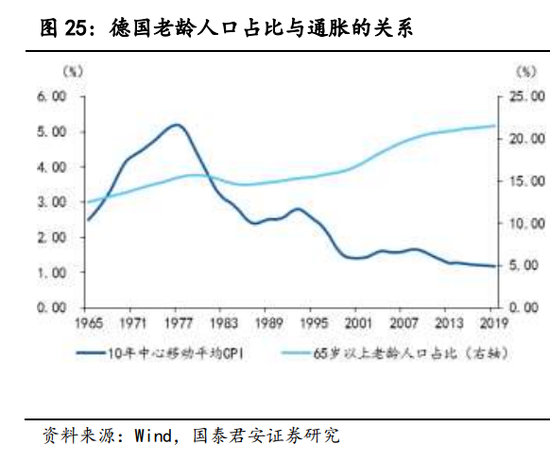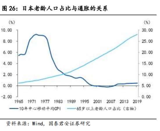 2)低通胀:深度老龄化和经济发展水平较高的情况下,人口结构老化在需求端对通货膨胀率的抑制作用大于供给端的拉动左右。