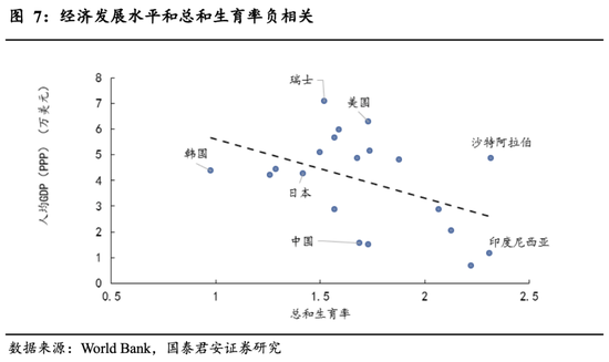 相对经济发展水平,我国生育率明显偏低。发展是最好的避孕药”,经济发展就会让人们享受到更加完善的社会福利和社会保障,使人们不必“养儿防老”;而经济发展后妇女受教育水平提高,会花更多的时间忙于事业和工作,因此生育意愿也会相应较低。国际比较来看,人均GDP(购买力平价)衡量的经济发展水平和总和生育率基本呈负相关。而我国位于整体趋势线的左下方,说明相对经济发展水平,我国生育率明显偏低。