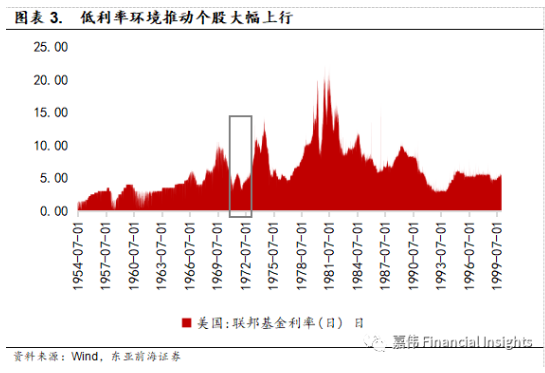 在二战后美国经济经历了一轮黄金十年的增长,政府减税,私人消费投资大幅增长,工业企业发展迅猛,股票市场呈现普涨情况。这时候在美国二战后第一批“婴儿潮”进入青年,带来巨大消费需求;也诞生了半导体、原子能、航天航空、电子计算机、高分子合成等影响深远的现代科技。为了应对布雷顿森林体系的瓦解,美联储实施了宽松的货币政策,联邦基金利率长期维持低位,同时尼克松政府实施“新经济”政策,政府部门支出大幅下降,私人部门消费投资明显增加,人们开始关注盈利稳健、低估值的上市公司,美股“漂亮50”就是这一时间成为人们关注的焦点。