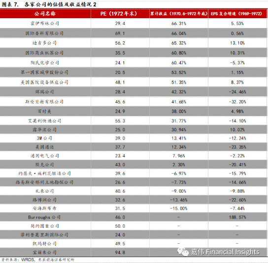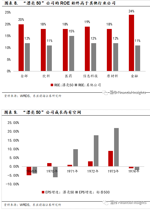 “漂亮50”因强劲稳健基本面获得估值溢价。“漂亮50”的个股大多在1970年代初有不俗的表现。大部分“漂亮50”个股的累计收益均为正,并获得较高的估值溢价,其中不乏今日耳熟能详的龙头公司,例如可口可乐、麦当劳、宝丽来及辉瑞公司等等。“漂亮50”公司具有强劲、稳健的基本面,公司业绩长期稳定增长。“漂亮50”组合中的公司盈利水平显著高于平均水平。“漂亮50”不断获得估值溢价,机构投资者纷纷追捧。