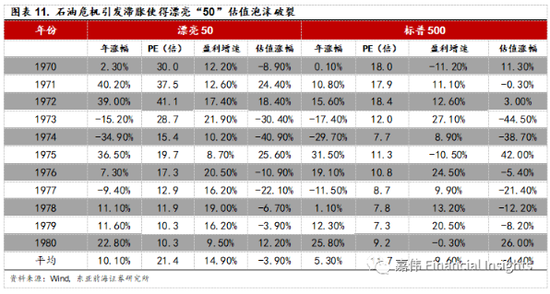 20世纪70年代的两次石油危机引发美国经济滞胀,终结“漂亮50”行情。第一次石油战争出现后,美国经济在1974年出现了一次短暂经济衰退,这次短期经济波动使得投资者降低了对龙头公司估值溢价,龙头企业盈利增速出现了短期负增长,基本面发生动摇。在此情况下,市场上高估值且负增长的公司冲击较大,同时推动了“漂亮50”估值逐渐泡沫化,伴随泡沫开始破裂,“漂亮50”股价快速下跌,最终使得机构抱团结束。1973年至1974年,漂亮“50”的盈利增速大幅下降,同时估值涨幅下跌了40.9%。值得注意的是,虽然公司业绩有所波动,但此次泡沫的破裂直接导火索为两次石油危机引发的高通胀,推动经济陷入滞胀环境,挥之不去的高通胀随后引发机构抱团土崩瓦解。