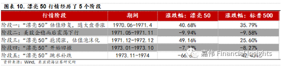 “漂亮50”的行情从1970年6月开始,至1972年底结束,前后共历时50个月。“漂亮50”行情大概经历了以下几个重要阶段:第一阶段主要表现为宽松货币政策及积极财政政策下的“漂亮50”和美股大盘普涨,1970年年中之后的10个月,美股估值修复行情,标普500在近一年的时间内上涨51%。此后,美股回归基本面,开始步入第二个阶段盘整阶段。1971年底开始,美股大盘企稳,“漂亮50”随之继续抱团上涨,但大盘开始震荡下行。此阶段“漂亮50”估值抬升加速,泡沫化现象随之诞生。截止1972年底,“漂亮50”再次上涨21%,同时带动估值进一步提升至史无前例的41倍;反观大盘,标普500的估值波动下降至14倍。1973年初石油战争导致美国进入滞涨状态,物价被不断抬升,股市集体下跌,“漂亮50”航企由此开始回撤,此阶段跌幅约7.33%,跌幅低于同期标普500的8.27%,股价仍有一定的韧性。1973年11月,“漂亮50”指数开始跳水补跌,而后在不到一年时间内跌幅达到67%,同期标普500跌幅为42.43%,此前的超额收益也全部丧失。