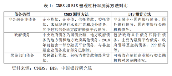 宏观杠杆率是经济某部门的总债务占GDP的比重,是债务存量与收入流量之比,用来衡量债务可持续性。国际清算银行(BIS)和中国社科院国家资产负债表研究中心(CNBS)均根据此定义测算宏观杠杆率。对比两者测算方法(表1)发现,BIS在测算非金融企业债务和政府债务中存在重复计算,一定程度高估了政府杠杆率,而CNBS剔除了实体经济债务重复计算部分,杠杆率数据更精确。本文参考CNBS债务计算范围测算了2019-2020年宏观杠杆率(图1),测算值略低于CNBS杠杆率, 但两者变动趋势一致,不同部门杠杆率增幅差异较小,表明测算结果较为可靠。