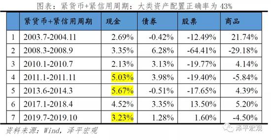 Ⅳ 紧货币+紧信用周期中,大类资产配置于现金的正确率仅为43%,7个小周期中仅有3个周期现金表现明显优于其他资产,在紧货币+紧信用的周期组合下,大类资产表现缺乏明显特征,商品、债券、股票都曾出现较好表现。