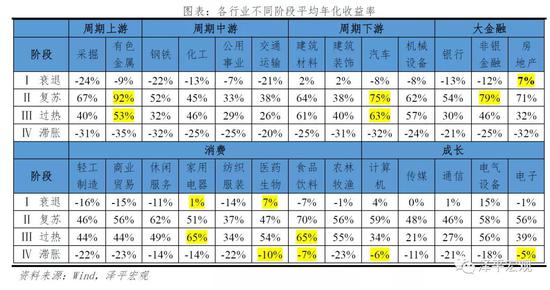 Ⅱ 复苏:周期板块中,周期上游>周期下游>周期中游,上中下游平均收益率分别为79.3%、40.5%、60.1%。其中上游有色金融、下游汽车行业收益率位于周期板块1、2位,远高于板块中其他行业。大金融板块中,非银金融>房地产>银行,阶段平均收益率分别为79.3%、71.4%、54.3%。其他板块内行业也有很好行情,收益率均在30%以上