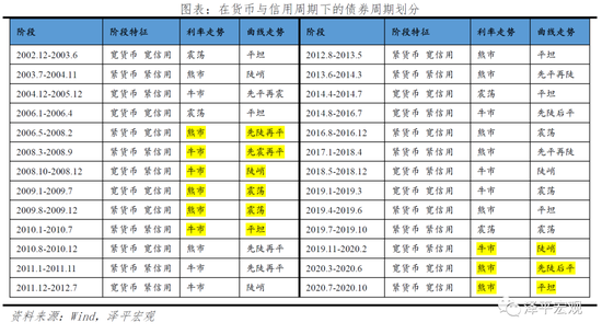 现实中,债券收益率形态较少严格遵循从牛陡、熊陡到熊平、牛平的周期轮动。我们以10年期中债国债到期收益率与1年期中债国债到期收益率数据,及10年期-1年期期限利差,确定期间内的利率走势以及曲线形态。阶段划分显示,仅2008-2010周期,2019-2020年周期,由于经济波动幅度较大,货币政策逆周期对冲特征明显,债券市场出现较为明显的轮动规律。