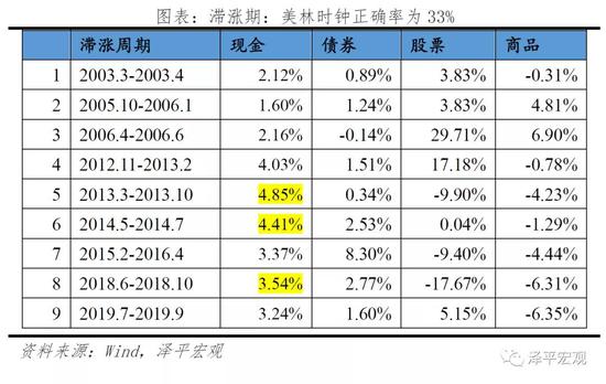 Ⅳ 滞涨期中,美林时钟正确率仅为33%,9个小周期中仅有3个周期现金收益率表现最好,其他在滞涨期表现较好的资产包括股票(4次)、债券(1次)、商品(1次)。