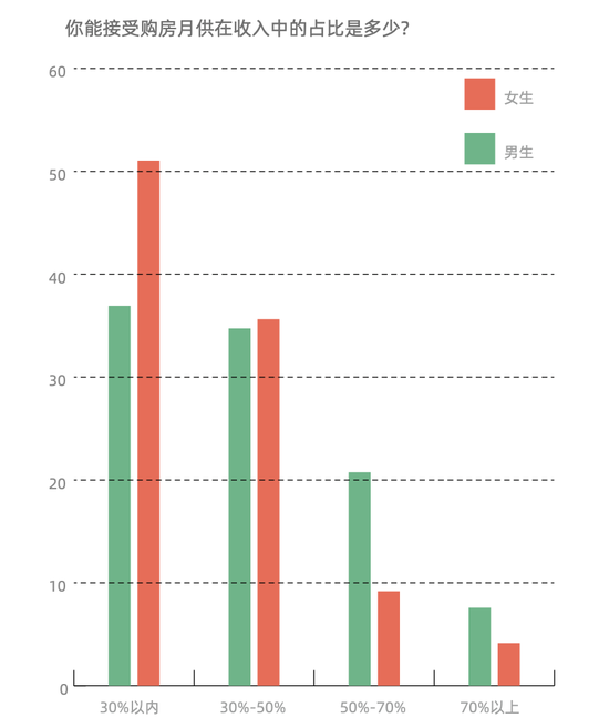 首付之后,月供也是压在部分女性身上的大山。《报告》显示,过半女性受访者对月供的承受能力在收入的30%以内。男性对月供压力上的忍耐力明显高于女性,20.76%的男性可以承受月供占收入的五成至七成,7.58%的男性可以承受月供占收入的七成以上,而女性对这两项的选择占比分别为9.18%和4.14%。