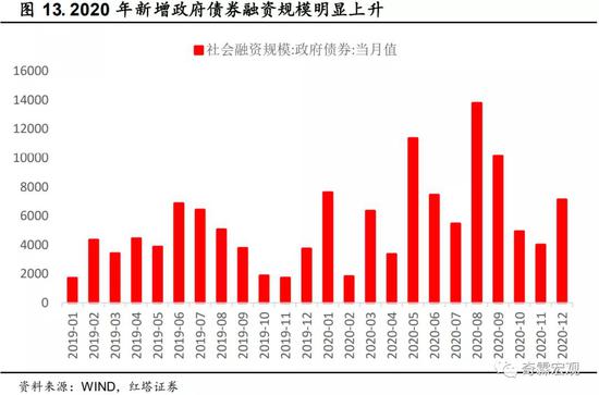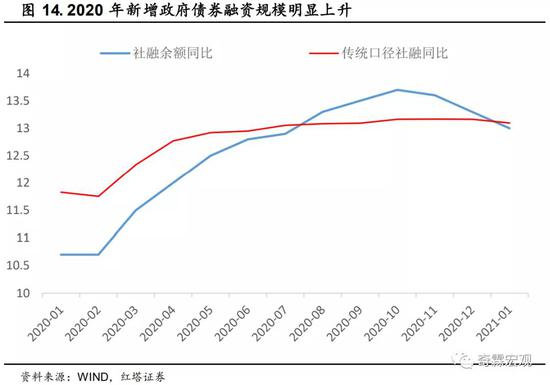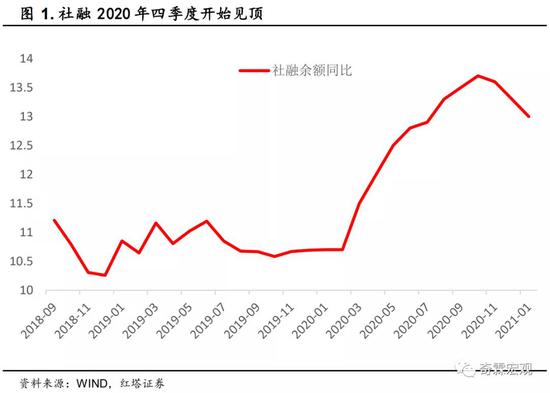 至于说见顶不见顶的标志,指的就是社融存量同比是不是见顶。从数据来看,2020年10月的社融同比高达13.7%,随后就持续下行至2021年1月的13%,社融同比数据确实有见顶的可能性。