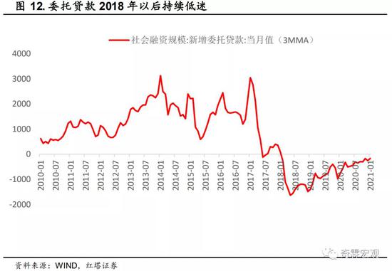 比如2017年的时候,社融因为非标高增长,增速比人民币信贷增速要高,但到了2018年后,随着金融去杠杆影响逐步显现,人民币信贷反而成为金融的稳定器,社融因非标持续萎缩,增速被持续拖累。