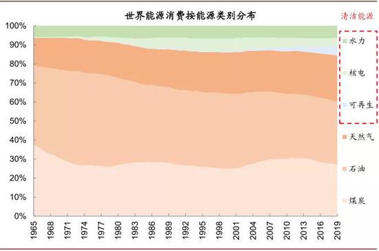 图表:非化石能源在能源消费中占比从1980年的9%逐渐提升至2019年的16%