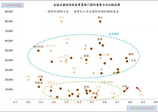 图表: 中国在全球产业链上的优势较为独特:相比发达国家高端人才成本仍低,比发展中经济体技术领先。