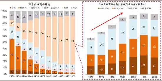 图表: 日本经济实现高质量发展的阶段,出口结构的升级及进口结构的降级:高附加值的机械类商品占比从1970年的46%持续扩张至1990年的75%